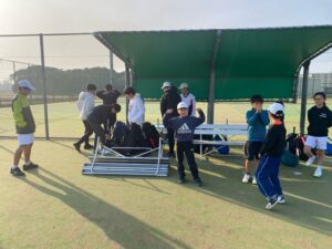 それが終わったら、早速オリンピックでサーブ以外のもののアップ。もちろん罰ゲーム付きで!合宿中盤からこうやり始めたのは、疲れているのに基礎練をやらせては士気が上がらないと思ったからです。その後は午前中と同じく6面に分かれて、サーブのアップからシングルス、3ゲーム先取でアップダウン!初めの内は大きい子と小さい子でやって欲しかったので、小さい子のコートがトップで大きい子のコートがドベです。打ち合わせで大きい子達に、遠慮なく打て!速いボールを受けられるようになるためには実際受けて、そこから慣れていかないと!と伝えてあったので、バシバシやってくれてます。でも中には打てなかったり、打つとミスをする子もいましたが、そういう子が試合で格下に負けるのです。だから良い訓練です。しばらくやって皆のポジションが落ち着いてきたところで止めて、次対戦する者同士でジャンケンをさせ、勝ち組と負け組に分けました。そうです、団体戦です!そして勝った負けたではなくて、総合得ゲーム数で競わせることにしました。そしてその次は、以前組ませたペアをふたチームに分けてダブルスでも団体戦です。これも総得ゲーム数で勝負ですしたが、シングルスもダブルスも結構盛り上がりました!ホテルニューオーツカ様、有難うございました!そして最後は再びプレイクザウォール!陽も落ちてきて暗くなり始めてましたし、肌寒くもなってきましたが、子供達はそんなの何のその。国分寺はこういうのが1番盛り上がる… 勝者達は2面だけコート整備をして、敗者達はボール拾いと4面のコート整備です。