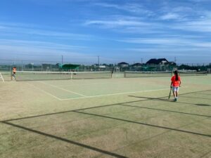 サーブをアップさせて、先程はストレートでしたが、今度はクロスでサーブからのアップダウン。でもこれはこの後やることへの準備に過ぎず、もうあと3面もネットを張って、シングルス10ポイントタイプレークでアップダウン。何で3面しか借りていないのに6面なんだ?と思うでしょうが、周りは田んぼで誰もいなかったので、有り難く拝借することにした次第です!