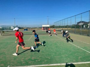 コートに着いて、いやー、暖かくって気持ちいい!と日向ぼっこしながら子供達をアップさせます。