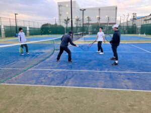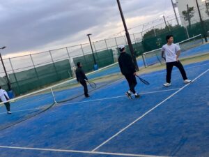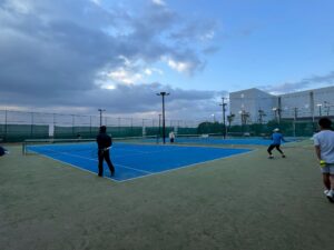 しかし海は目の前ということもあってか風がスゴイ… なのでアップはヒロ、ユート1号、トーマちゃんと私でボレーボレーだけやって、あとは風に慣れることを1番の目的としてストレート・クロスをやりました。色々企業秘密のこと(当たり前のことですが、いちいち書くのが面倒くさいので!)を伝えながらやり、中盤からはまずまずちゃんと打てていました。サーブもクイックにさせて確率を落とさないようにして終了!それにしてもものすごい風なのに、トーマちゃんだけが帽子を被っていて、いちいちそれが落ちる… 当たり前だろ!これがキーポイントであとワンショットで決められる!という時に落ちて、レットになってもいいのか!どうしても被りたければ、糊ででも着けておけ!ということがありました!